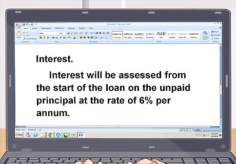 State the interest rate. You also should state when interest begins to accrue and how the interest rate is calculated, for example, by year. Sample text: “Interest. Interest will be assessed from the start of the loan on the unpaid principal at the rate of 6% per annum.”