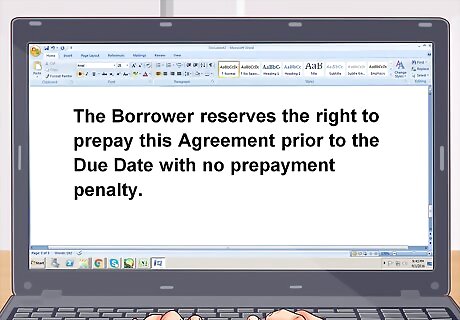 Include a clause about prepayment. State whether or not prepayment of the entire loan is allowable. If you allow it, then add the following: “The Borrower reserves the right to prepay this Agreement prior to the Due Date with no prepayment penalty.”