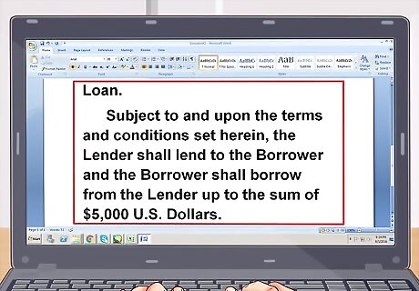 State the amount of money borrowed. Once you have identified the parties, you will need to identify the amount of the loan. Write: “Loan. Subject to and upon the terms and conditions set herein, the Lender shall lend to the Borrower and the Borrower shall borrow from the Lender up to the sum of $5,000 U.S. Dollars.”