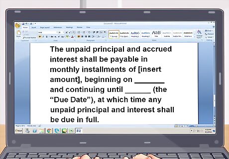 Provide the repayment schedule. State how often payments are made, as well as when the first payment is due and when the last is due. For example, “The unpaid principal and accrued interest shall be payable in monthly installments of [insert amount], beginning on _______ and continuing until ______ (the “Due Date”), at which time any unpaid principal and interest shall be due in full.” To figure out the monthly payment, you can visit this calculator. You can enter the loan amount, the length of repayment (“loan term”), and the interest rate. The calculator will then tell you the monthly amount. You can also print out an amortization schedule after you have entered the information.