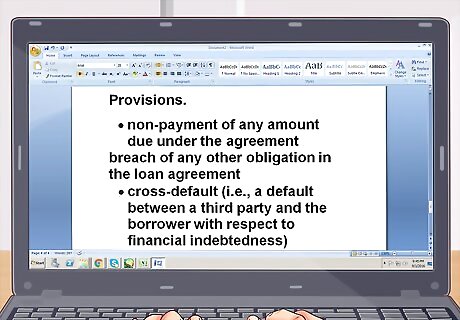 Include default provisions. You need to identify events that qualify as default and then state the consequences. Often, lenders state that a default will accelerate payment, so that the entire loan amount becomes immediately due. Common events that qualify as default include: non-payment of any amount due under the agreement breach of any other obligation in the loan agreement cross-default (i.e., a default between a third party and the borrower with respect to financial indebtedness) the borrower’s insolvency any materially adverse change in the borrower’s position (i.e., job loss, business closure, etc.) You can state “If any one or more of the following events shall occur and be continuing, the Lender may, at its option, declare the outstanding amount immediately due and payable:” and then list the qualifying events as bullet points underneath.