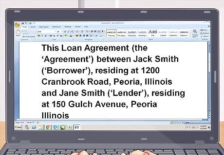 Identify the parties. A contract is an agreement between two parties. Accordingly, you need to identify both parties to the loan agreement. Be sure to identify each party by whether it is the “Borrower” or the “Lender” and include each party’s address. For example, you might want to write: “This Loan Agreement (the ‘Agreement’) between Jack Smith (‘Borrower’), residing at 1200 Cranbrook Road, Peoria, Illinois and Jane Smith (‘Lender’), residing at 150 Gulch Avenue, Peoria Illinois…”
