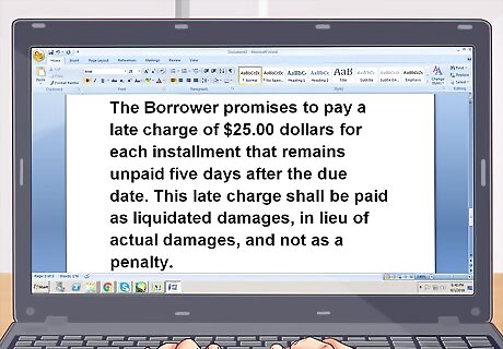 Insert a clause on late fees. To induce the borrower to pay in a timely manner, you may want to include a late fee. You may be familiar with late fees from your credit card. Include any grace period. Sample language could be, “The Borrower promises to pay a late charge of $25.00 dollars for each installment that remains unpaid five days after the due date. This late charge shall be paid as liquidated damages, in lieu of actual damages, and not as a penalty.”