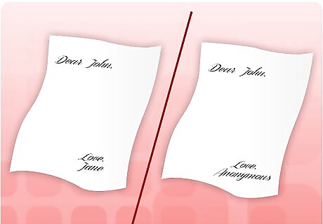 Sign it "Love, (insert your name here)". If you wish to remain anonymous, leave your name out whilst hinting him at who you are. Don't sign it anything out of place or too girly because he might just as well freak out. For instance, do not say, 'Be mine forever' or 'I love you!' A simple 'love' will do.
