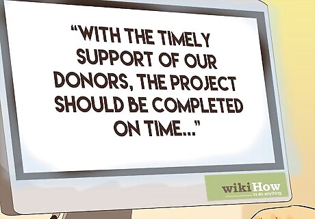 Crafting the report conclusion. Use the conclusion to briefly remind the reader of the most important issues and the project's objective. Focus on your project's forward momentum and goals in the conclusion. Remind your reader what is needed going forward. You could write, “With the timely support of our donors, the project should be completed on time and under budget by next May.” Highlighting the needs can help ensure that the project is completed on time.
