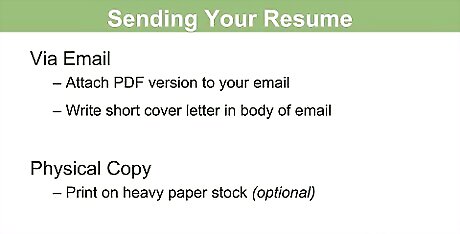 Apply to babysitting jobs that interest you. Regardless of how you found out about a specific babysitting job, you will most likely need to provide the family with a copy of your resume. You can do this one of two ways - you can print a copy of your resume to provide to the family, or you can send the PDF version of your resume via email. Which option you use should depend on what the family requests. If you aren't sure what they'd prefer, ask. If you do need to print your resume, you may want to consider purchasing slightly heavier paper stock from an office supply store. This type of paper feels heavier and thicker than the standard paper you use everyday in your printer. In many cases it also comes in different subtle colours that can make a nice background for your resume. Don't go overboard with the paper, as you don't want to detract from what's on your resume.