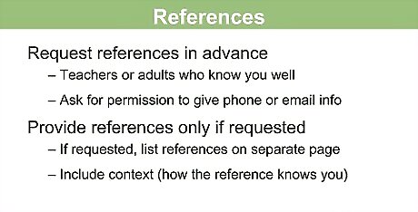Obtain references in advance. Normally you would not list a reference on a resume itself, but provide it when asked by a potential employer. You can either provide a copy of a written letter, or you can provide the name and contact info for your reference. A potential employer may simply want to read comments from former employers, or they may wish to talk to a former employer via phone or email and ask specific questions. If you're providing a reference as just a name and contact info, you must be certain that the person whose name you're providing actually wants to give you a positive reference. Always check with them before you give out their contact info, and if possible, tell them which positions you're applying for. For most non-babysitting jobs you will want to avoid using a family member as a reference. But since many babysitting jobs may be found via word of mouth from your family, including a family member as a reference should be okay. If possible, limit family members to only one of your references.