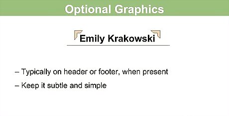 Add some graphics or embellishments to the header and footer. Graphics and embellishments are not required on a resume, but if you want to add some creativity, this is one place where it'll stand out. These graphics and embellishments should be simple, elegant and in no way overwhelming. They should work to enhance what's on your resume, and make your resume stand out from the crowd. And it should go without saying that these graphics should never include anything obscene or anything that may be misunderstood by an adult. One possible embellishment would be to add one or more lines to the header or footer, or in between sections. The format of the line, including its width, it us to you. Embellishments might also include small artistic symbols, webdings or wingdings. You can even use symbols instead of standard bullets when you're making a list. One possible graphic idea is to add a subtle watermark to the page, using a simple graphic. The graphic could be your initial in really fancy calligraphic font, or a simple picture that you feel represents you. If you ever expand your resume to be more than one page, put page numbers in the footer. If your resume is only one page long, do not put any page numbers.