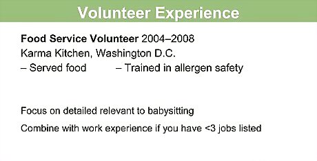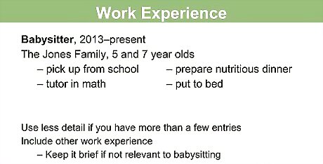 List your work experience. Work experience is normally any past or current experience you've had where you've been paid to do a job. Obviously, volunteer experience can be any work you did where you were not paid. Assuming you have at least two past work experiences that you want to include, create a separate section for any volunteer experience you've had. In normal circumstances, when you list work experience, you would include the name of the position you held, the name of the department you worked in, the name of the overall company, and the location where you worked (e.g. Customer Service Representative, Women's Shoes, Sears, Seattle, WA). When you're listing prior babysitting experience, you have two options: (1) include the name of the family you babysat for, or (2) list the family generically. The two examples may look like this: (1) Babysitter, The Smith Family - 6 year old & 3 year old, Los Angeles, CA, or (2) Babysitter, Family with 3 and 6 year olds, Los Angeles, CA. Each position you list on your resume should include at least 2-3 bullet points that describe what you did at that particular job. Each of these bullet points should start with a verb in the past tense (if you are no longer working at that job) or a verb in the present tense (if you're still currently at the job). Some example verbs to use are: conducted, directed, planned, oversaw, monitored, arranged, coordinated, encouraged, assisted, demonstrated, motivated, supported. Some example babysitting-related descriptions are: designed creative games and activities to keep children engaged; prepared nutritious meals; escorted children on outings to the local park; oversaw completion of child's homework. You should also list each job in chronological order - from most recent at the top of the list, to least recent at the bottom of the list. The final result of one job entry in your work experience section should look something like this: Babysitter, The Johnson Family - two 7 year olds, Portland, ME. January 2013 to August 2013. Escorted children home from school. Prepared a nutritious after-school snack each day. Assisted children with homework assignments. Escorted children to local playground in good weather.
