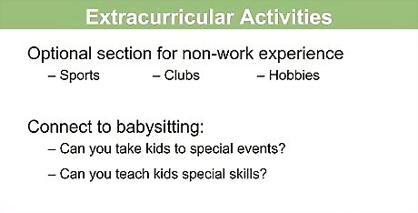 Input your extracurricular activities. Extracurricular activities can include a large variety of things that you do outside of school - sports teams, formal clubs and organizations (e.g. Girl Guides, Scouts, etc.), and information clubs (e.g. book club, gaming club, etc.). It can also include extra things you've done at school like being in the school play, playing on a school sports team, and being a member of school club. Listing extracurricular activities on your resume isn't required, but it's nice to have. Showing potential employers that you have a wide variety of skills and interests is beneficial, especially if some of those skills and interests align with the skills and interests of your potential employer!