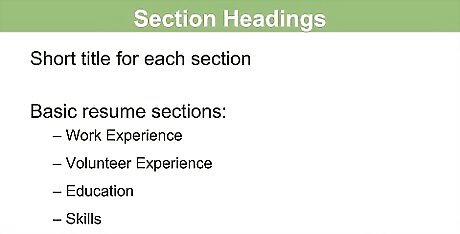 Decide on your section headings. You will need to create headings for each major section of your resume. Which headings you need will depend on which sections you've decided to include in your resume. The section headings usually stand out nicely by simply bolding the font, but you can also use a slightly different font for the headings instead. The words you use in each heading should make the contents of that section obvious and should be short enough that the reader can skim through them quickly. Some possible section headings you may want to consider are: Professional Summary, Professional Objectives, Overview, Skills & Abilities, Qualifications, Work Experience, Volunteer Experience, Work & Volunteer Experience, Education, Training, Education & Training, Extra-Curricular Activities, Technical Knowledge, Technical Skills.