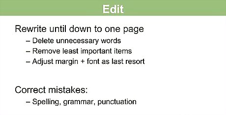 Review your resume and make corrections. Once your resume has all the content entered, and is completely formatted, read through it at least a couple of times. Look for spelling and grammar mistakes, and for any sentences or statements that don't seem to make sense. Make any corrections or edits you want. If you find there's a lot of white space on your resume (i.e. empty space), you may want to use this opportunity to add some more items. This could include more statements about your skills and abilities, or a couple more sentences describing the work you've performed for past jobs. If your resume is longer than 1 page, reformat certain parts of the resume in order to fit it onto 1 page. You can make adjustments to the margins or font size, or remove some of your statements. Make sure your resume is formatted to fit on a normal Letter-sized piece of paper.