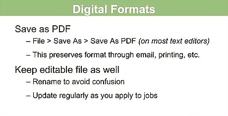 Save your resume as a PDF file. To save yourself time and effort in the future, keep a copy of your resume in a format that can be easily updated (i.e. doc, docx, txt, etc.) and save a FINAL version as a PDF. You might end up having multiple PDF versions of your resume over time, but only one version of the most recent editable format. Whenever you need to make a change or update to your resume, you would open the editable version, make the change, save the editable version, then also save the final version as a PDF (with the appropriate name). Depending on the reason for the various versions, you may wish to make the name of the PDF explanatory. This will help you keep them organized going forward. For example: My Resume - Summer, My Resume - School, My Resume - Oct 2014, etc.