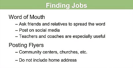 Search for potential babysitting jobs. Getting a babysitting job via word of mouth is probably the easiest and safest method to use. Talk to your parents, teachers, coaches, neighbours, friends, fellow churchgoers, etc., about whether they know anyone who is looking for a babysitter. Also make the same people aware that you're available for babysitting, and to share your contact info with anyone who might be looking for a babysitter. You can also try spreading the word via social media that you're available for babysitting, assuming your social media account wouldn't hinder you getting a job. You can also consider posting a flyer that contains limited personal information, but only post them in trusted areas like a community centres, local recreation centres, local job or career centres, libraries, churches or other religious buildings, etc.