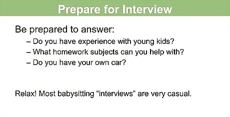 Prepare yourself for potential interview questions. Even though a lot of information is contained on your resume, sometimes a potential employer wants to here you explain the details of your previous jobs or experiences. For babysitting jobs, it is also likely that you'll be asked specific questions about your experience with children, and what sort of things you're willing to do with kids. While you may know how you would answer all these questions, it doesn't hurt to practice, or even write down your responses. There's nothing wrong with bringing a notebook or clipboard with you to an interview. Practicing how you'd answer the questions is also important as you may be nervous during the actual interview. If you've repeated your answers to yourself several times before the interview, you have a better chance of remembering exactly what to say in the interview. Do a quick web search to find career sites with some commonly asked babysitter interview questions and think about how you'd answer each one.