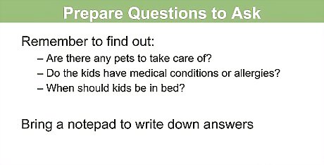 Have a list of questions to ask at the interview. The employer or parents aren't the only ones allowed to ask questions at an interview - you're allowed to ask questions as well, and you should. In order to make sure you remember the questions you want to ask, write them down in advance and bring the list with you. Check off each question as it is answered throughout the interview. Additional questions may come to mind as you are talking during the interview, and some of your prepared questions may get answered without you needing to ask them. Some potential questions you may want to ask the parents are: How many kids will I be taking care of, and what are their ages? Do any of the children have any medical conditions or allergies that I need to be aware of? Does the family have any pets that will be at home while I'm babysitting? If so, do I need to do anything for the pets? Am I allowed to take the children on outings? And if so, where can I go? (If you have a license and are driving, you should also ask if you're allowed to take the children in your car.) Will one of the parents drive or escort me home at the end of the night (if you haven't driven yourself)? What types of activities do the parents want you to do with the kids, if any? Do they expect you to entertain the kids while you're there, or can the kids do what they want?