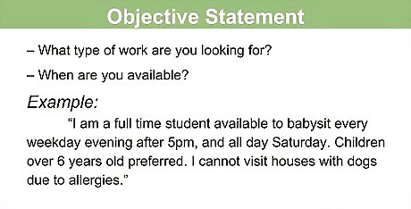 Create a summary or objective statement. A summary or objective statement should be approximately 2-4 sentences long and written in paragraph form, as opposed to point form with bullets. The purpose of such a statement is to outline what it is you're looking for in terms of work, and why you'd be an excellent choice for that work. As you are likely a student, and you might possibly have other responsibilities or engagements (e.g. chores, sports, clubs, etc.), you might want to use this statement as an opportunity to explain what days and times you're available for babysitting. You can update your summary or objective statement as often as you want. For example, you might have different availability during school months than you do during the summer months, or during holidays. You may want to create two separate resumes - one for school months and the other for holidays. You can submit or send whichever resume is relevant when you're job searching.