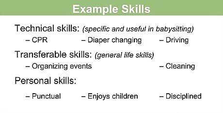 Think about your various skills and abilities. Most skills and abilities can be divided into three categories - technical, transferable, and personal. Technical skills are very specific skills that are needed to carry out very specific tasks. For a babysitter, a technical skill may be knowing how to perform CPR. Transferable skills are more general skills that can be used to carry out a variety of tasks. For a babysitter, a transferable skills may be the ability to be organized and plan events. Finally, personal skills are attributes that describe your work ethic and personality. For a babysitter, personal skills would include being trustworthy, honest, organized and on time. Think about the various types of skills and abilities you possess and write them down. Search for skill or ability words online to narrow down the exact words you'd like to use to describe yourself. Write out several sentences that describe your skills and abilities as they relate to babysitting. The exact number you should include on your resume will depend on how many you're able to come up with, and how much space you have. Examples of skills and abilities that are relevant to babysitting are: playful, active, responsible, flexible, patient, trustworthy, punctual, calm in an emergency, persuasive.