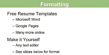 Find a resume template or create your own. Start by looking at word processing software like MS Word, Google Docs or Pages. Many of them come with resume templates of different styles and design. You can also find many free templates available for download on the internet. You can either select a template to use “as is” and simply add your personal information, or you can select a template and alter some of the formatting to create something more unique. Or, if you're more creative, you can create a resume template from scratch. While the resume templates that come with well-known software like MS Word are a great starting point, keep in mind that everyone who has access to MS Word can potentially use the same template. That means that employers may receive a stack of resumes from potential candidates that all look the same! Your resume will not stand out in such a situation. This may not be a problem when you're only looking for babysitting positions, but keep it in mind as you start to apply to other types of positions like retail stores, restaurants, offices, etc.