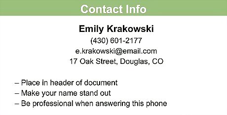 Put your name and contact information in the document header. Every resume needs to contain your name, your (home) address, your phone number(s), and your email address. The best place to put these items is in the header. Having them in the header will help control the formatting and ensure these items are displayed on every page of your resume, if your resume is more than 1 page in length. Your name should be the very first thing on a resume, and it should stand out. You can make your name stand out by: using bold, using a larger font size than the rest of the document (e.g. 14-18 pt), or using a different font than the rest of your resume (e.g. use a fancy font like Copperplate for your name, but use Arial for the rest of your resume). Your address, phone number(s) and email can be in the same font size and font as the rest of the document. Or, you can keep it the same font size as the rest of the document, but use a slightly different font. You'll want to use an address that is most relevant to the jobs you're seeking. For example, if you're looking for babysitting jobs while spending the summer at your cottage, put your cottage address on your resume. Try to limit how many phone numbers you list on your resume. Ideally only use one phone number, but if you need to put a home and cell phone number, that's fine. Just remember your phone etiquette for those phone numbers once you start circulating your resume! For your first resume it is recommended that you keep it to 1 page. As you add more experience, you can expand to a second page if needed.