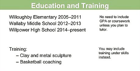 Write out your education and training. Your education will be fairly straightforward as it'll be the elementary and high schools you've attended so far. If you specialized in a particular subject at any of those schools, you can include that info. But you do not need to list all the courses you've taken. Training, however, is any type of education you've had outside the school environment. This may include first aid courses, sports lessons, art courses, babysitter training, animal behaviour courses, and so forth. You can tailor which training courses you include on your resume to match the type of jobs you're applying for. For example, if you're only using the resume to apply for babysitting jobs, listing babysitter training, first aid training and maybe art courses would be great.