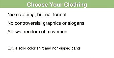 Dress presentably for the interview. Babysitting isn't a formal office job where you need to wear a suit and tie, but dressing nicely is always a plus when going for an interview. You may want to avoid clothing that has rips or tears in it, or shirts that have graphics or words that may be offensive or confusing. Wear shoes that you can easily take off, as you'll most likely be interviewed in the family's home. Remember that the parents who are interviewing you will probably judge you a little based on your appearance, so don't give them anything to misjudge you by.