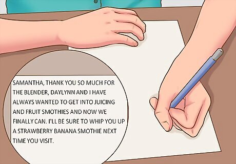 Detail how you plan to use the gift. Instead of merely thanking them for their present, make each guest feel like their gift will be put to use by detailing how you plan on using it in your married life. A good example would be, “Samantha, thank you so much for the blender. Daylynn and I have always wanted to get into juicing and fruit smoothies and now we finally can. I’ll be sure to whip you up a strawberry banana smoothie next time you visit.”