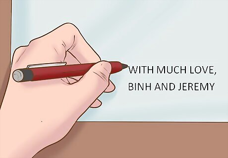Wrap it up with love. A good way to end each note is by saying thank-you once again and signing the bride and groom's names to the note, if their names were not mentioned within the text. Instead of saying something bland like “All the best,” try an ending like, “With Much Love, Ben and Jeremy.”