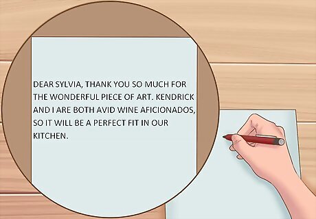 Learn how to be thankful for gifts you hate. Inevitably you will receive gifts that are useless, distasteful, or downright gaudy. Nevertheless, you must find a way to express your gratitude, even if it’s a bit insincere. For example, if you were gifted an ugly picture of a wine cork with the $10 price still attached, you could write, “Dear Sylvia, thank you so much for the wonderful piece of art. Kendrick and I are both avid wine aficionados, so it will be a perfect fit in our kitchen.”