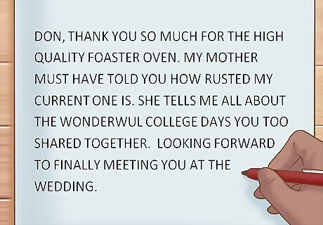 Be tactful when writing to strangers. Some obscure family members or unknown family friends may send you gifts before the wedding, but you still need to try your best to make their card feel personal. For example, you could write, “Don, thank you so much for the high quality toaster oven. My mother must have told you how rusted my current one is. She tells me all about the wonderful college days you two shared together. Looking forward to finally meeting you at the wedding.”