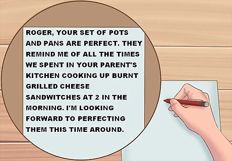 Use specifics. Every thank-you card should incorporate the guest’s name and gift. Do your best to personalize each note and try to incorporate some specific fact or memory about that person into your writing. For example, instead of writing “Roger, I appreciate your set of pots and pans,” consider writing, “Roger, your set of pots and pans are perfect. They remind me of all the times we spent in your parent’s kitchen cooking up burnt grilled cheese sandwiches at 2 in the morning. I’m looking forward to perfecting them this time around.”