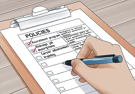 Choose effective policies. Based on input from employees and an analysis of your organization's needs and resources, you should be able to predict which policies have the greatest chance for success. For example, one policy approved for affirmative action plans under federal regulations is the creation of a recruitment program designed to attract qualified minorities or women for particular positions within your organization. You also may decide to redesign job descriptions to redistribute work so that positions require lesser knowledge or skills than they previously did to attract members of groups that historically did not have access to training. While you must solve the problems identified in your self-analysis, your policies should be narrowly tailored to avoid unnecessary restrictions on opportunities for your employees as a whole.