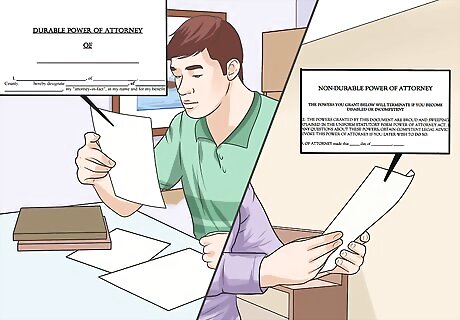 Determine which type of power of attorney that you need. Power of attorney documents can pertain either financial matters, health care, or both. There are also two varieties of power of attorney: durable and non-durable. A financial power of attorney enables someone to make financial decisions for the person who grants it. A health care power of attorney enables someone to make medical decisions for an incapacitated individual. A regular (non-durable) power of attorney will remain in effect for the duration that is specified in the document. It will cease to have an effect if the principal becomes incapacitated. Alternatively, a durable power of attorney will remain in effect after the principal is incapacitated.