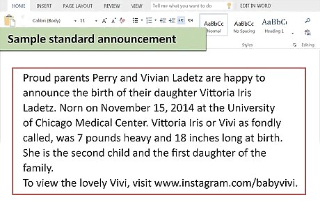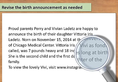 Revise the birth announcement as needed. Make sure to edit the announcement before turning it in. Check for typos and any extra words you don’t need. Have a friend or family member read it. Also, run it by your partner to make sure he or she approves. Ensure that it meets the guidelines set by the paper before sending it in, including the word count. If you’re not the parents, run it by them. Don’t be afraid to move things around or to add or subtract if you don’t feel the announcement is right.