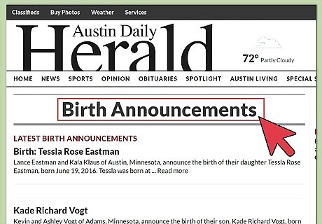 Pick a newspaper or newspapers. Decide on a newspaper that is most appropriate for your purposes and for your audience. Are there certain people you want to reach? Your local newspaper is always a good choice, but you may also want to pick one in your hometown. Local newspaper. This is a good way to inform your friends, coworkers, and neighbors. National newspaper. By using a national newspaper, you'll be able to share your announcements with friends and family who live around the country. Newspaper in grandparents' hometown. This way the grandparents will be able to share the birth with their friends and others in the community.