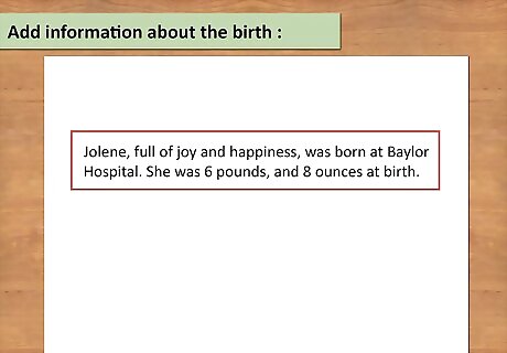 Add information about the birth. Include the baby’s size, and the hospital, if appropriate. Adding this information will give the reader more information about the baby and the setting of the birth. For example: “Jolene was born at Baylor Hospital. She was 6 pounds, 8 ounces at birth, and 18 inches (45.7 cm) long.” You can also use more flare in order to make the announcement "pop." For example “Jolene, full of joy and happiness, was born at Baylor Hospital. She was 6 pounds, and 8 ounces at birth.” Feel free to exclude this information if you want.