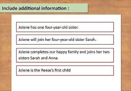 Include information about any siblings the new baby has or how the baby will complete the family. This will give the reader a better idea about your family, and will remind friends you've fallen out of touch with about your other children. “Jolene has one four-year-old sister.” "Jolene will join her four-year-old sister Sarah.” "Jolene completes our happy family and joins her two sisters Sarah and Anna.” Alternatively, you can say whether she is the first child or not: “Jolene is the Reese’s first child.”