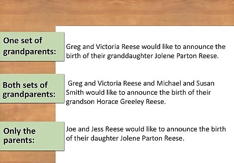 Decide who will be named in the announcement and where they will be named. Often times, both parents and grandparents are named in the announcement. Depending on where the parents and grandparents live, and who is putting out the announcement, there are several different options. If the grandparents are putting out the announcement and everyone lives in the same community, the grandparents can choose to either put their names first or the parents' names first. Both sets of grandparents can also decide to cooperate on putting the announcement out, and include the names of both sets of grandparents. If the parents are putting out the announcement and everyone lives in the same community, they can choose whose names to use. If the parents are putting out the announcement and they live in a different community as the grandparents, they should use their own names.