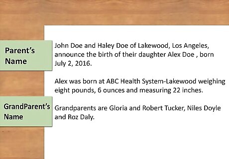 Include all of the basic and important information. This information is the core of the birth announcement and will include everything someone will need to know to be well-informed about the birth of the baby. Make sure to include the following: Parents' and grandparents' full names. You can choose to include middle names, initials, or not. The baby’s full name. The baby's birth date. The baby's gender. You can choose to leave this out, but it might be helpful if the gender is not clear from the baby’s name. The baby's weight and length. This is often included but not required.