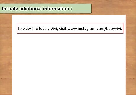 Add any extra information, if you want and if you have the space. This information can be either informative or can simply add detail to your announcement. This information does not have to come at the end. You can sprinkle it in wherever. Just make sure there is good flow and keep the word count in mind. The time and location of religious ceremonies. A website address that features extra information or photos for family and friends. Consider thanking the staff of the hospital or a specific nurse or doctor if anyone went out of their way.