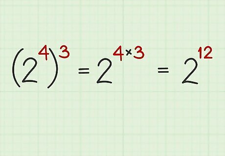 Use the power rule for exponents raised to exponents. When you have a base with an exponent, and then that is raised to another exponent, you find the solution by multiplying the exponents together. The base remains unchanged, as in the following examples: ( 2 4 ) 3 = 2 ( 4 ∗ 3 ) = 2 12 {\displaystyle (2^{4})^{3}=2^{(4*3)}=2^{12}} (2^{4})^{3}=2^{{(4*3)}}=2^{{12}} ( 5 3 ) 3 = 5 ( 3 ∗ 3 ) = 5 9 {\displaystyle (5^{3})^{3}=5^{(3*3)}=5^{9}} (5^{3})^{3}=5^{{(3*3)}}=5^{9} ( x 2 ) 5 = x ( 2 ∗ 5 ) = x 10 {\displaystyle (x^{2})^{5}=x^{(2*5)}=x^{10}} (x^{2})^{5}=x^{{(2*5)}}=x^{{10}}