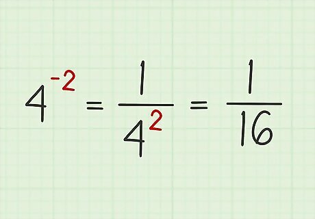 Write negative exponents as a reciprocal. Whenever a base number has a negative exponent, that number should be read as the reciprocal of the base. Thus, ( 1 2 ) − 1 = 2 {\displaystyle ({\frac {1}{2}})^{-1}=2} ({\frac {1}{2}})^{{-1}}=2. The negative exponent does not make the number negative. If the negative exponent appears in the denominator of a fraction, then the reciprocal would move the base number into the numerator. Consider the following examples: 4 − 2 = 1 4 2 = 1 16 {\displaystyle 4^{-2}={\frac {1}{4^{2}}}={\frac {1}{16}}} 4^{{-2}}={\frac {1}{4^{2}}}={\frac {1}{16}} 5 − 3 = 1 5 3 = 1 125 {\displaystyle 5^{-3}={\frac {1}{5^{3}}}={\frac {1}{125}}} 5^{{-3}}={\frac {1}{5^{3}}}={\frac {1}{125}} 1 2 − 2 = 2 2 = 4 {\displaystyle {\frac {1}{2^{-2}}}=2^{2}=4} {\frac {1}{2^{{-2}}}}=2^{2}=4 ( 1 2 ) − 2 = 2 2 = 4 {\displaystyle ({\frac {1}{2}})^{-2}=2^{2}=4} ({\frac {1}{2}})^{{-2}}=2^{2}=4 x − 4 2 = 1 2 x 4 {\displaystyle {\frac {x^{-4}}{2}}={\frac {1}{2x^{4}}}} {\frac {x^{{-4}}}{2}}={\frac {1}{2x^{4}}}