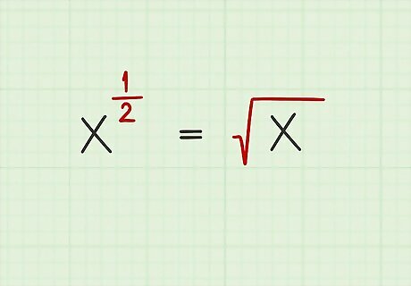 Write fractional exponents as radicals. Any exponent that is a fraction indicates that you are to find the root of the base number that corresponds to the denominator of the fraction. For example, an exponent of 1 2 {\displaystyle {\frac {1}{2}}} {\frac {1}{2}} means you are to find the square root of the base number. An exponent of 1 3 {\displaystyle {\frac {1}{3}}} {\frac {1}{3}} means you are to find the cube root of the base number. A number in the numerator of a fraction exponent works an a regular exponent would. Thus, a fractional exponent can mean both a root and a power at the same time. See these examples: x 1 2 = x {\displaystyle x^{\frac {1}{2}}={\sqrt {x}}} x^{{{\frac {1}{2}}}}={\sqrt {x}} x 1 3 = x 3 {\displaystyle x^{\frac {1}{3}}={\sqrt[{3}]{x}}} x^{{{\frac {1}{3}}}}={\sqrt[ {3}]{x}} x 3 2 = x 3 {\displaystyle x^{\frac {3}{2}}={\sqrt {x^{3}}}} x^{{{\frac {3}{2}}}}={\sqrt {x^{3}}} x 2 3 = x 2 3 {\displaystyle x^{\frac {2}{3}}={\sqrt[{3}]{x^{2}}}} x^{{{\frac {2}{3}}}}={\sqrt[ {3}]{x^{2}}} 3 3 2 = 3 3 = 27 = 3 3 {\displaystyle 3^{\frac {3}{2}}={\sqrt {3^{3}}}={\sqrt {27}}=3{\sqrt {3}}} 3^{{{\frac {3}{2}}}}={\sqrt {3^{3}}}={\sqrt {27}}=3{\sqrt {3}}