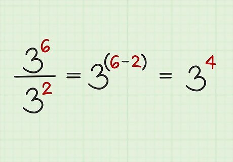 Subtract exponents to show division. When numbers with exponents are divided, you can find the result by subtracting exponents. The base number remains unchanged. This rule only applies if the bases are the same. See these examples: 3 6 3 2 = 3 ( 6 − 2 ) = 3 4 {\displaystyle {\frac {3^{6}}{3^{2}}}=3^{(6-2)}=3^{4}} {\frac {3^{6}}{3^{2}}}=3^{{(6-2)}}=3^{4} 5 8 5 3 = 5 ( 8 − 3 ) = 5 5 {\displaystyle {\frac {5^{8}}{5^{3}}}=5^{(8-3)}=5^{5}} {\frac {5^{8}}{5^{3}}}=5^{{(8-3)}}=5^{5} x 10 x 4 = x ( 10 − 4 ) = x 6 {\displaystyle {\frac {x^{10}}{x^{4}}}=x^{(10-4)}=x^{6}} {\frac {x^{{10}}}{x^{4}}}=x^{{(10-4)}}=x^{6} x 5 y 4 = x 5 y 4 {\displaystyle {\frac {x^{5}}{y^{4}}}={\frac {x^{5}}{y^{4}}}} {\frac {x^{5}}{y^{4}}}={\frac {x^{5}}{y^{4}}}…. (Because the bases are different, there is no change.)