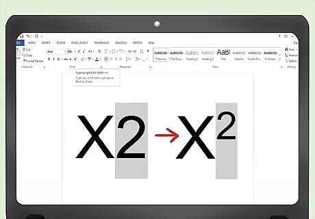 Use superscript to write exponents in Microsoft Word. When you are working on a document in Microsoft Word and want to print an exponent, first type the base number. Then select the “Home” tab. In the “Font” section of the toolbar, select the superscript function, which appears on the toolbar as “X.” Type your exponent and it will appear in the appropriate position. Click the superscript button again to turn it off and return to regular typescript. An alternate way to do the same thing is to type your base and your exponent as regular numbers. Use your mouse to highlight the exponent and, while highlighted, then click on the exponent button on the toolbar. The number will automatically move into the exponent position.