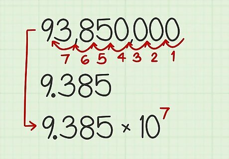 Count the number of places to the decimal point as the exponent. To finish the scientific notation number, count the number of digits in the original number and write that as the power of 10. In the example of 93,850,000, after placing the decimal after the 9, there are seven following digits, the 3,8,5,0,0,0, and 0. Therefore, the final number in scientific notation is 9.385 x 10. For decimals, count the number of spaces from the original decimal point to the new position of the decimal point, and use that number for the exponent. In this case, the exponent will be negative. For the example of 0.00000002457, the new decimal will be placed after the 2, so there are eight spaces before it - the seven zeroes and the 2. Therefore, the number in scientific notation will be 2.457 x 10.