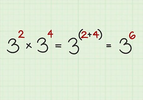Add exponents together to show expanded multiplication. When numbers with exponents are multiplied by each other, you can represent the result easily by adding the exponents together. The base number remains unchanged. This rule only applies if the bases are the same. See these examples: 3 2 ∗ 3 4 = 3 ( 2 + 4 ) = 3 6 {\displaystyle 3^{2}*3^{4}=3^{(2+4)}=3^{6}} 3^{2}*3^{4}=3^{{(2+4)}}=3^{6} 5 4 ∗ 5 1 = 5 ( 4 + 1 ) = 5 5 {\displaystyle 5^{4}*5^{1}=5^{(4+1)}=5^{5}} 5^{4}*5^{1}=5^{{(4+1)}}=5^{5} 10 3 ∗ 10 3 = 10 ( 3 + 3 ) = 10 6 {\displaystyle 10^{3}*10^{3}=10^{(3+3)}=10^{6}} 10^{3}*10^{3}=10^{{(3+3)}}=10^{6} x 5 ∗ x 2 = x ( 5 + 2 ) = x 7 {\displaystyle x^{5}*x^{2}=x^{(5+2)}=x^{7}} x^{5}*x^{2}=x^{{(5+2)}}=x^{7} ( a − 3 ) 2 ∗ ( a − 3 ) 4 = ( a − 3 ) ( 2 + 4 ) = ( a − 3 ) 6 {\displaystyle (a-3)^{2}*(a-3)^{4}=(a-3)^{(2+4)}=(a-3)^{6}} (a-3)^{2}*(a-3)^{4}=(a-3)^{{(2+4)}}=(a-3)^{6} 3 4 ∗ 2 5 = 3 4 ∗ 2 5 {\displaystyle 3^{4}*2^{5}=3^{4}*2^{5}} 3^{4}*2^{5}=3^{4}*2^{5}…. (Because the bases are different, there is no change.)