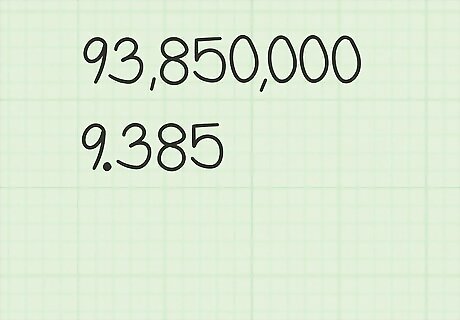 Write the first digit as a whole number. When you have a very large or very small number that you wish to express in scientific notation, the first step is to write the first digit of the number in the “ones” column. Then put down a decimal point, followed by any other numbers. For example, to begin writing 93,850,000 in scientific notation, set the first digit, 9, in the ones column, followed by a decimal point and the remaining numbers. This will look like 9.385. You can drop any zeroes that appear at the end. For very small decimals, do the same thing, but drop any leading zeroes. Thus, the number 0.00000002457 would be written as 2.457.