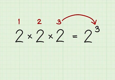 Use exponents to show repeated multiplication. When a number is multiplied by itself any repeated number of times, you can use an exponent as a shortcut. The exponent shows the number of times that the base is being multiplied. This rule applies to any base, whether it is a number, a variable, or even a mathematical expression. Look at the following examples: 2 ∗ 2 ∗ 2 = 2 3 {\displaystyle 2*2*2=2^{3}} 2*2*2=2^{3} 5 ∗ 5 ∗ 5 ∗ 5 = 5 4 {\displaystyle 5*5*5*5=5^{4}} 5*5*5*5=5^{4} 7 ∗ 7 = 7 2 {\displaystyle 7*7=7^{2}} 7*7=7^{2} 10 ∗ 10 ∗ 10 ∗ 10 ∗ 10 ∗ 10 ∗ 10 = 10 7 {\displaystyle 10*10*10*10*10*10*10=10^{7}} 10*10*10*10*10*10*10=10^{7} x ∗ x ∗ x = x 3 {\displaystyle x*x*x=x^{3}} x*x*x=x^{3} ( x + 2 ) ( x + 2 ) ( x + 2 ) = ( x + 2 ) 3 {\displaystyle (x+2)(x+2)(x+2)=(x+2)^{3}} (x+2)(x+2)(x+2)=(x+2)^{3}