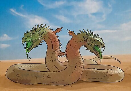 Amphisbaena The amphisbaena is a venomous ant-eating serpent with heads on either end of its body. Descriptions also mention glowing eyes and, in some cases, more dragon-like features (such as wings and small, rounded ears). In Greek myth, the amphisbaena was spawned from the blood dripping from Medusa’s severed head when the hero Perseus flew over the Libyan Desert carrying it.